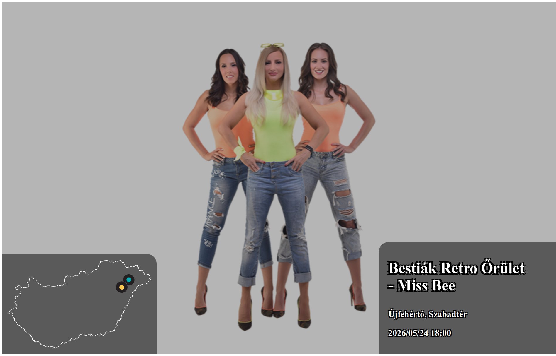 Az itt megjelenő eseményeket a produkció, vagy annak képviselője rögzítette. Az oldalon lévő információk valódiságáért a Koncertbooking.com ennek kapcsán felelősséget nem tud vállalni. Indulás előtt ellenőrizze az adott település vagy eseményhelyszín oldalán is a rendezvény paramétereit.