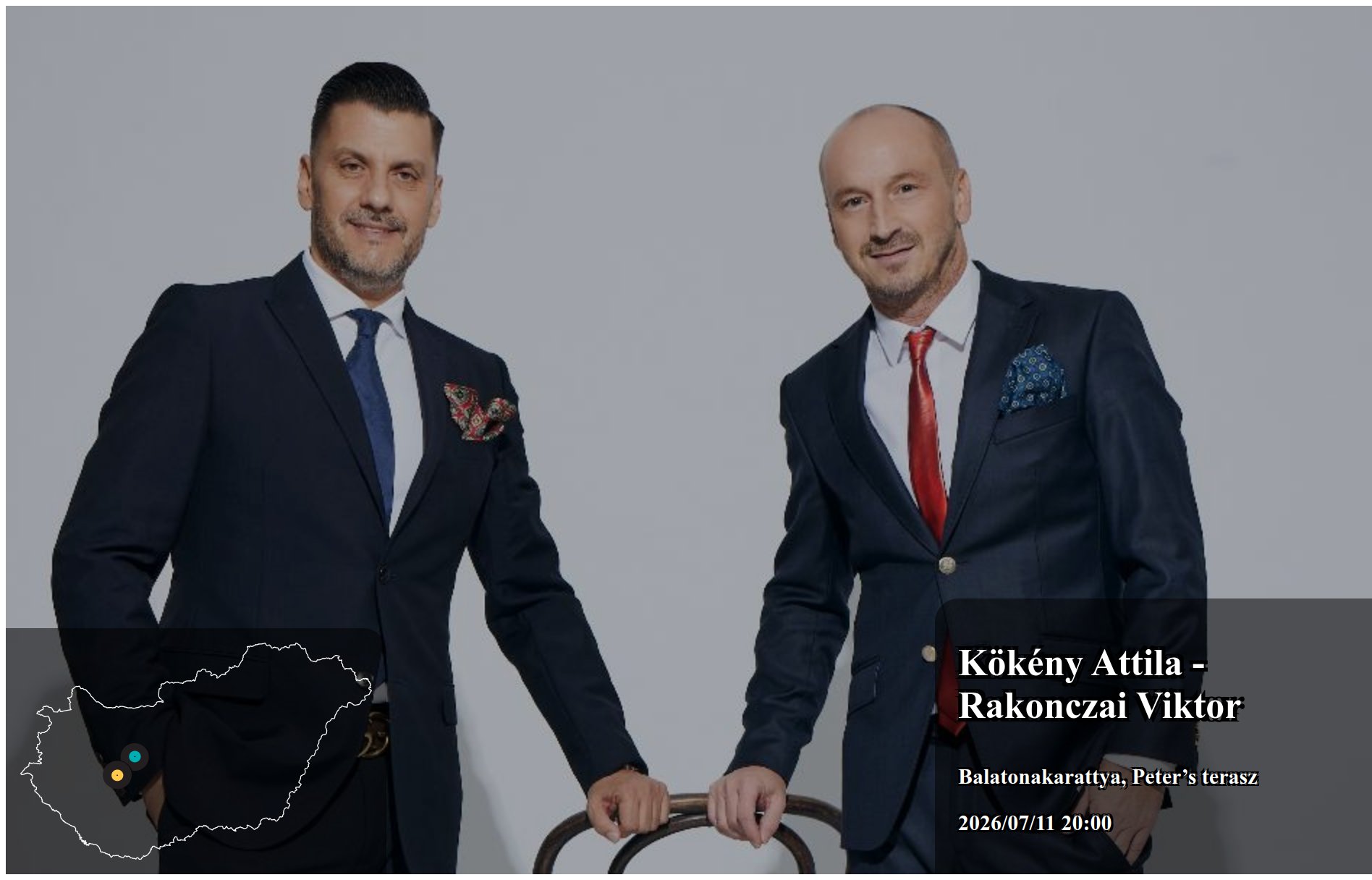Az itt megjelenő eseményeket a produkció, vagy annak képviselője rögzítette. Az oldalon lévő információk valódiságáért a Koncertbooking.com ennek kapcsán felelősséget nem tud vállalni. Indulás előtt ellenőrizze az adott település vagy eseményhelyszín oldalán is a rendezvény paramétereit.